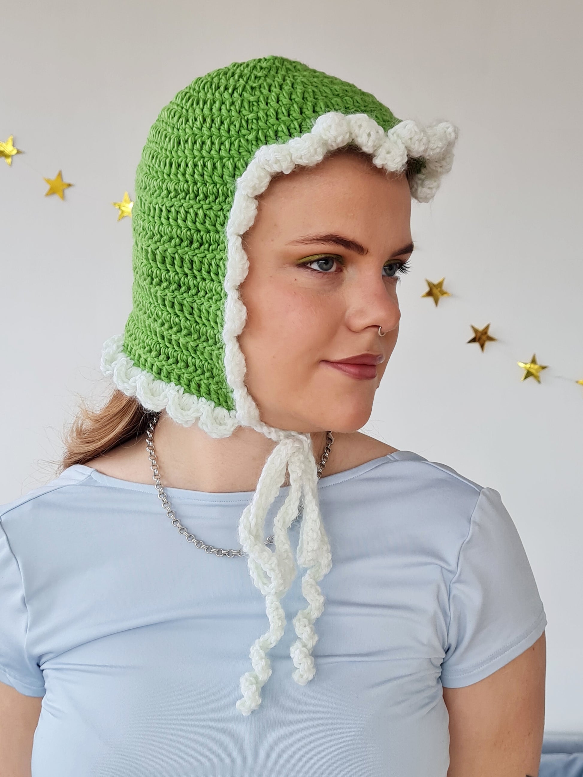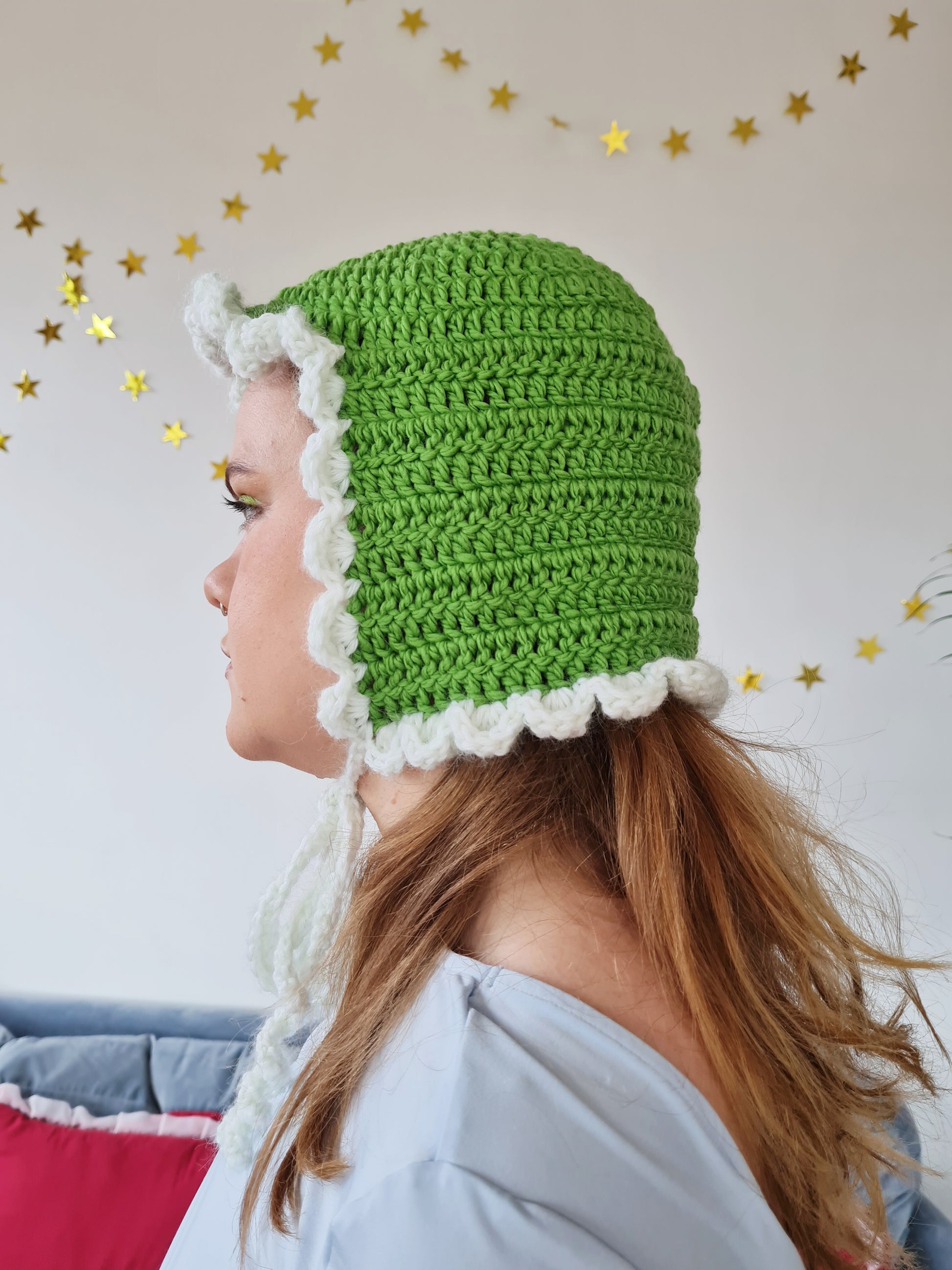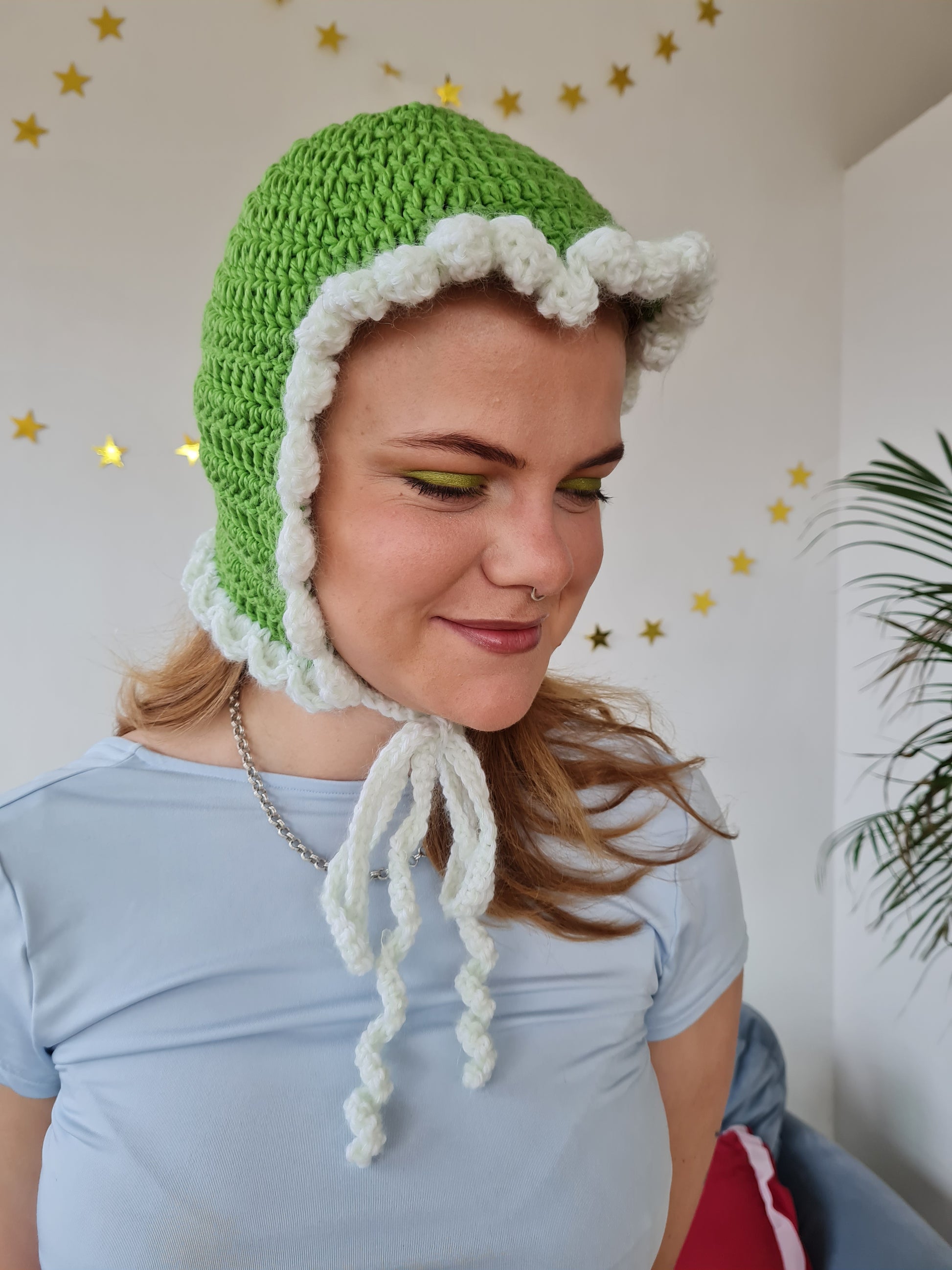 Light green with a white and green frilled face frame and long ties at the base to make a bow or knot