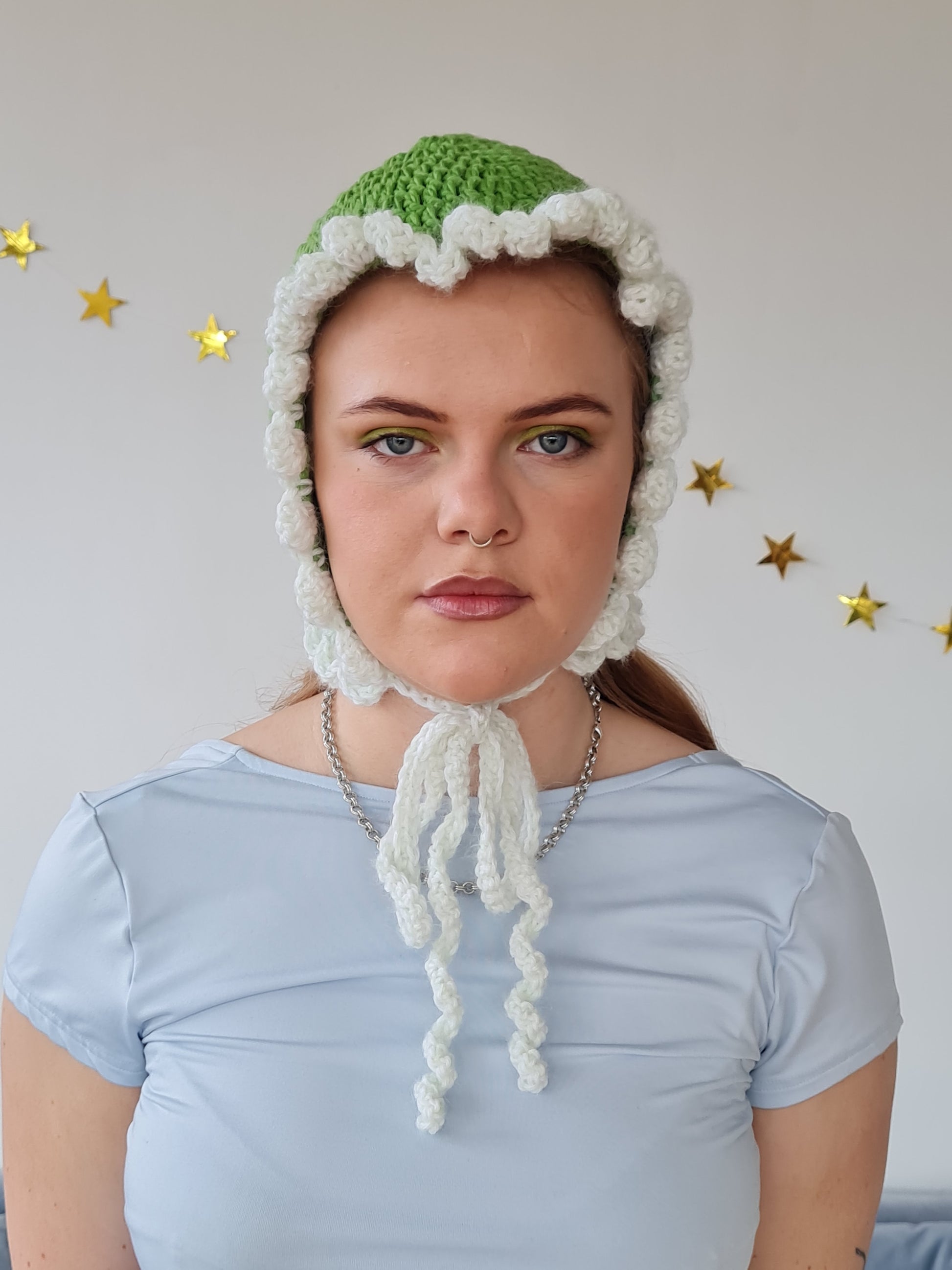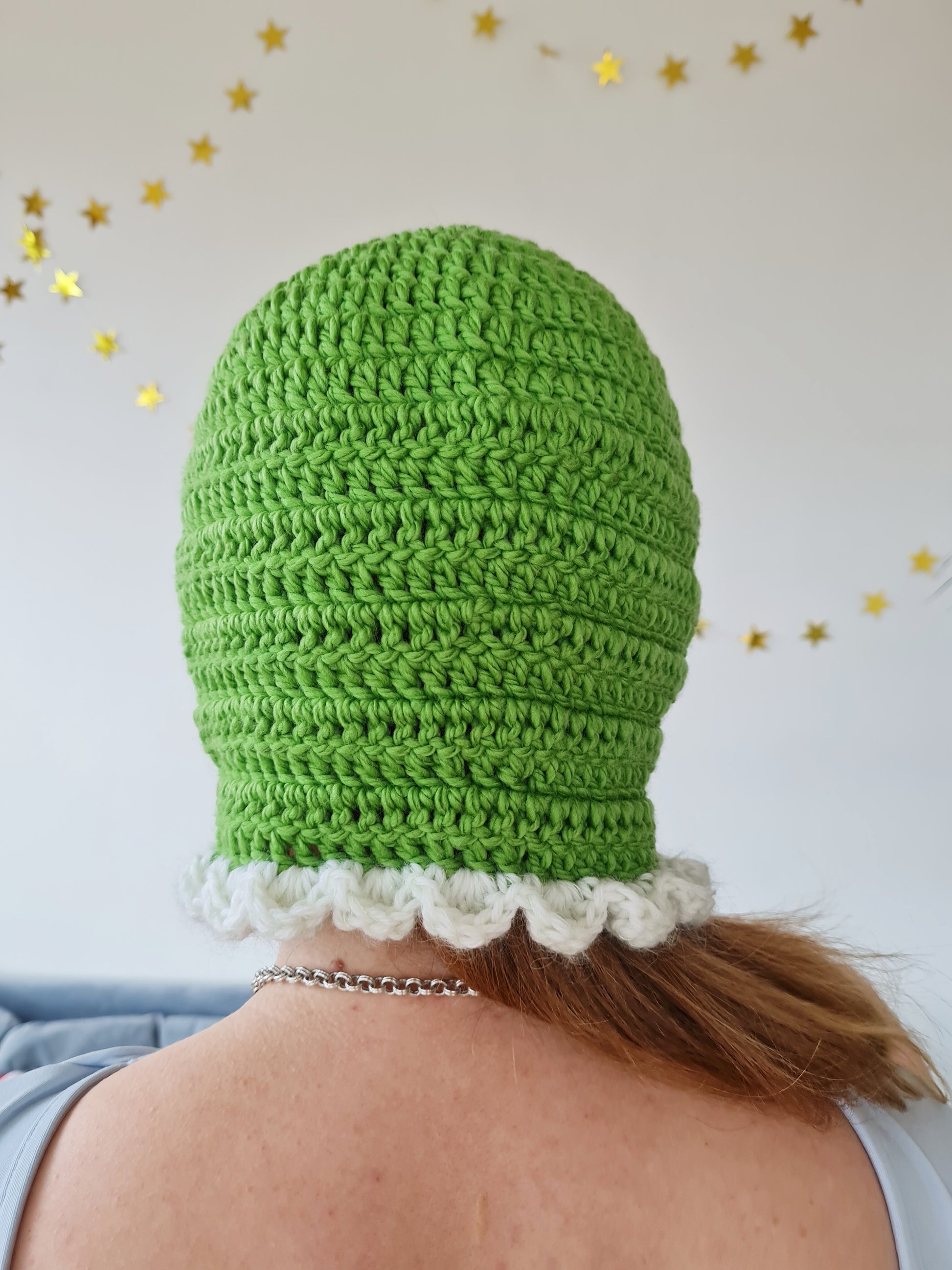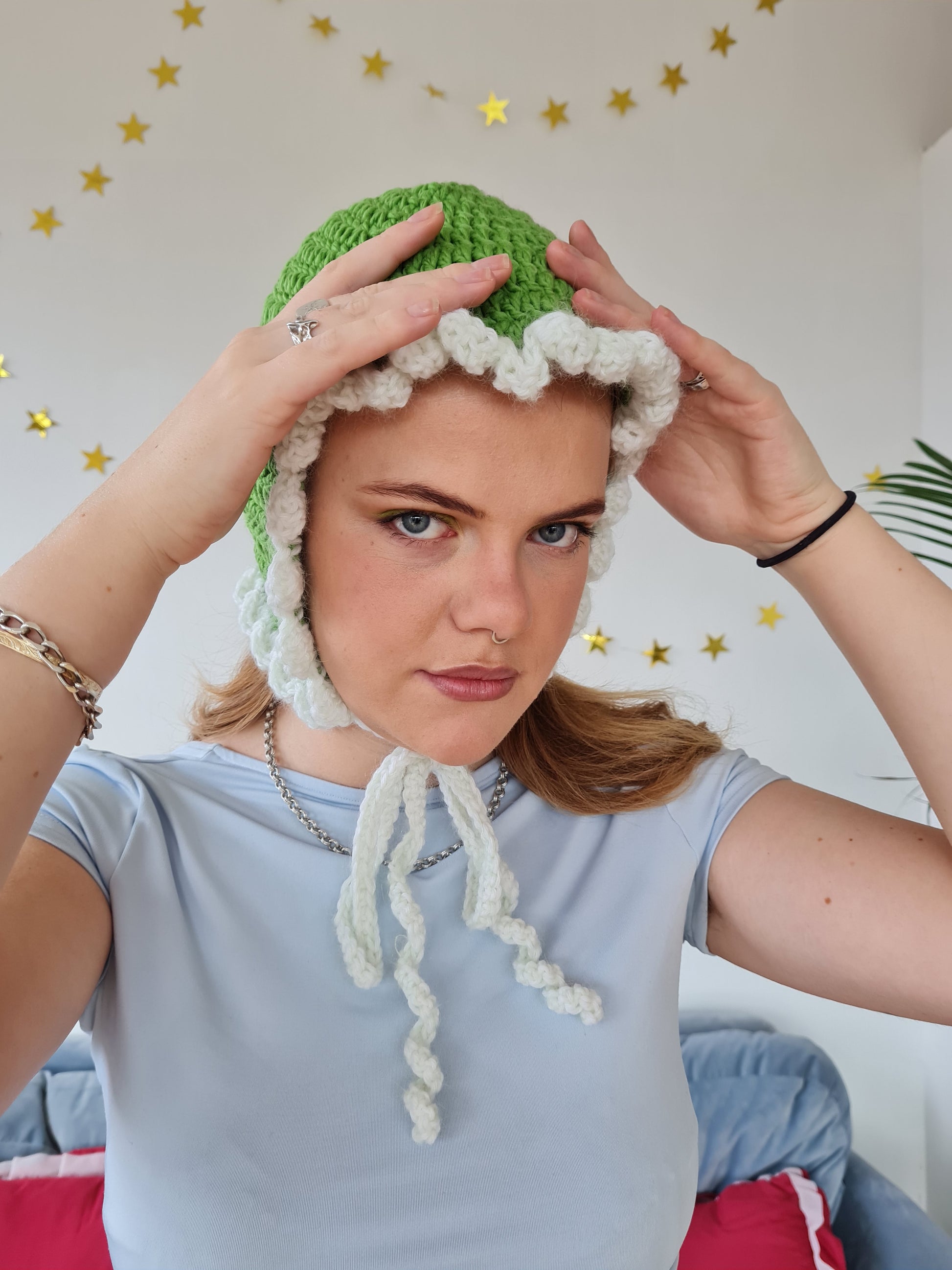Light green with a white and green frilled face frame and long ties at the base to make a bow or knot