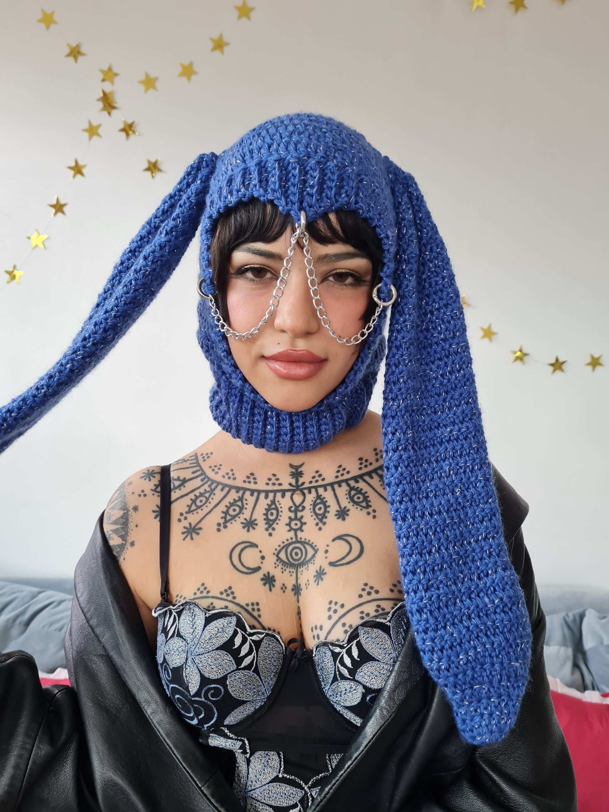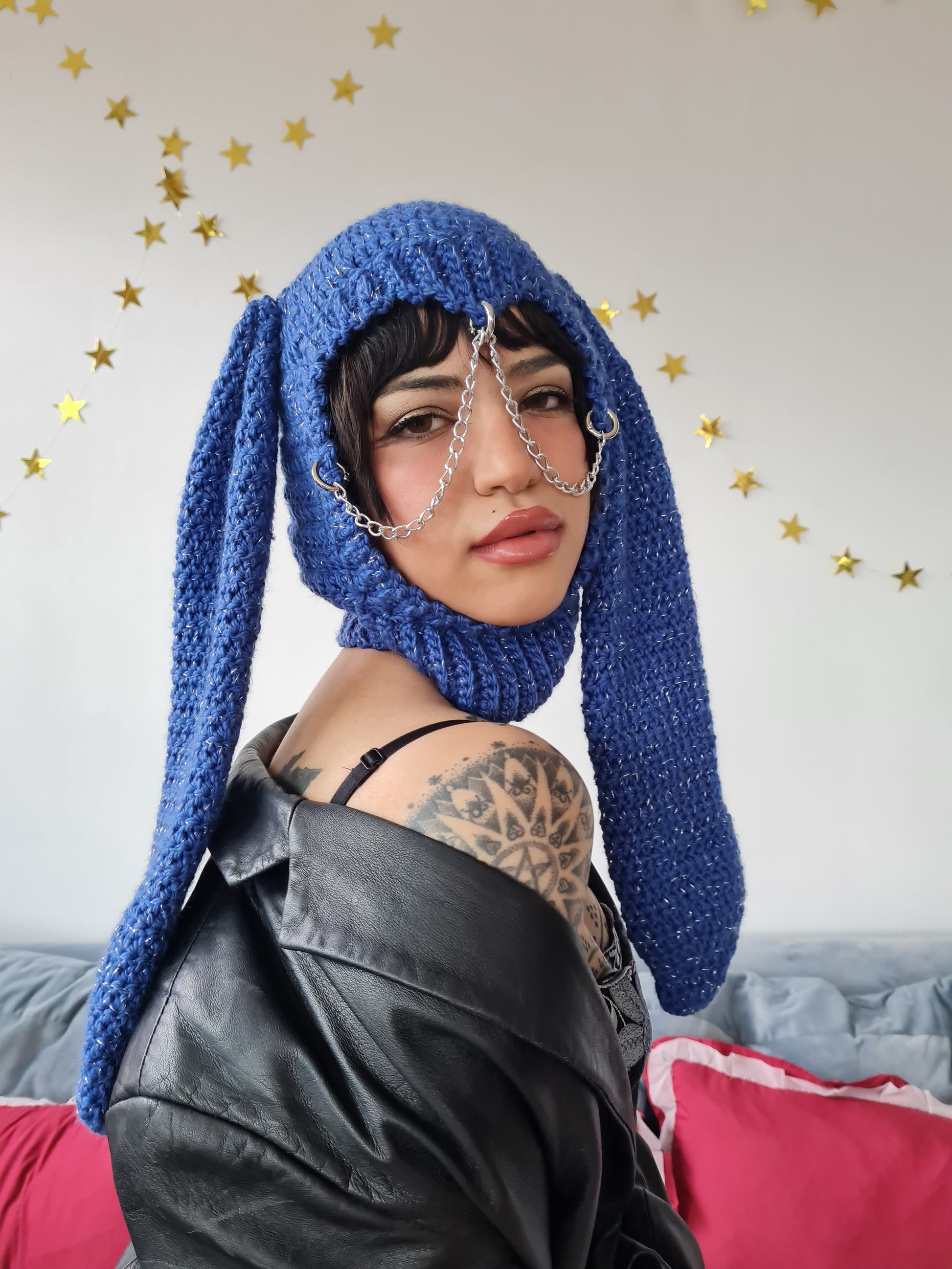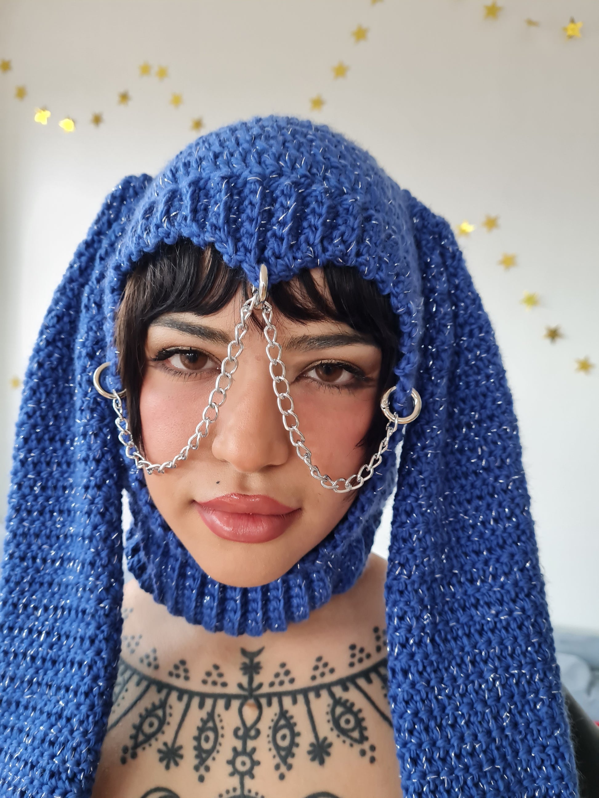 These hoops are removable and can be moved around the Bunnyclava. Wear them across the back or on an ear to create your own look!