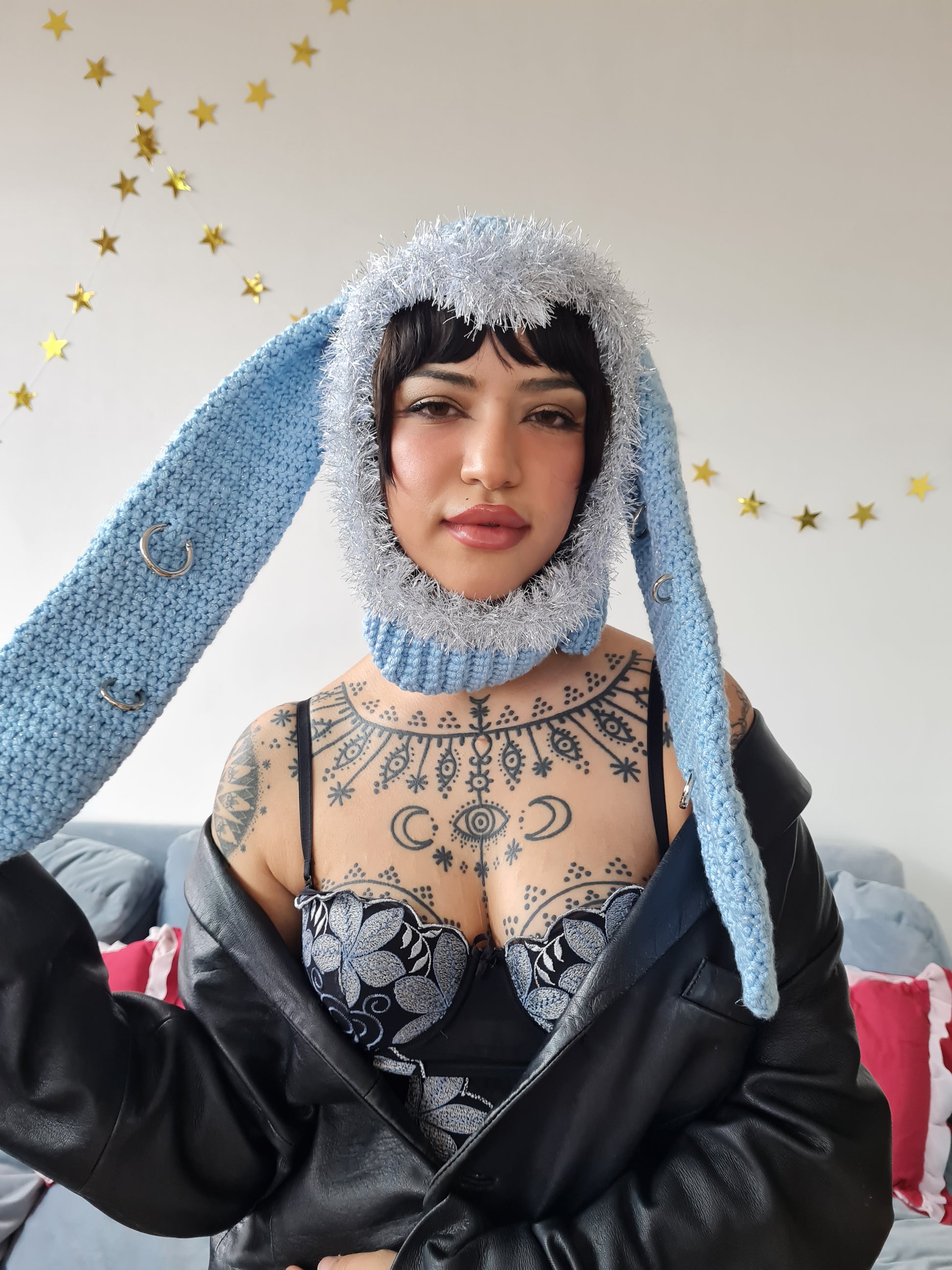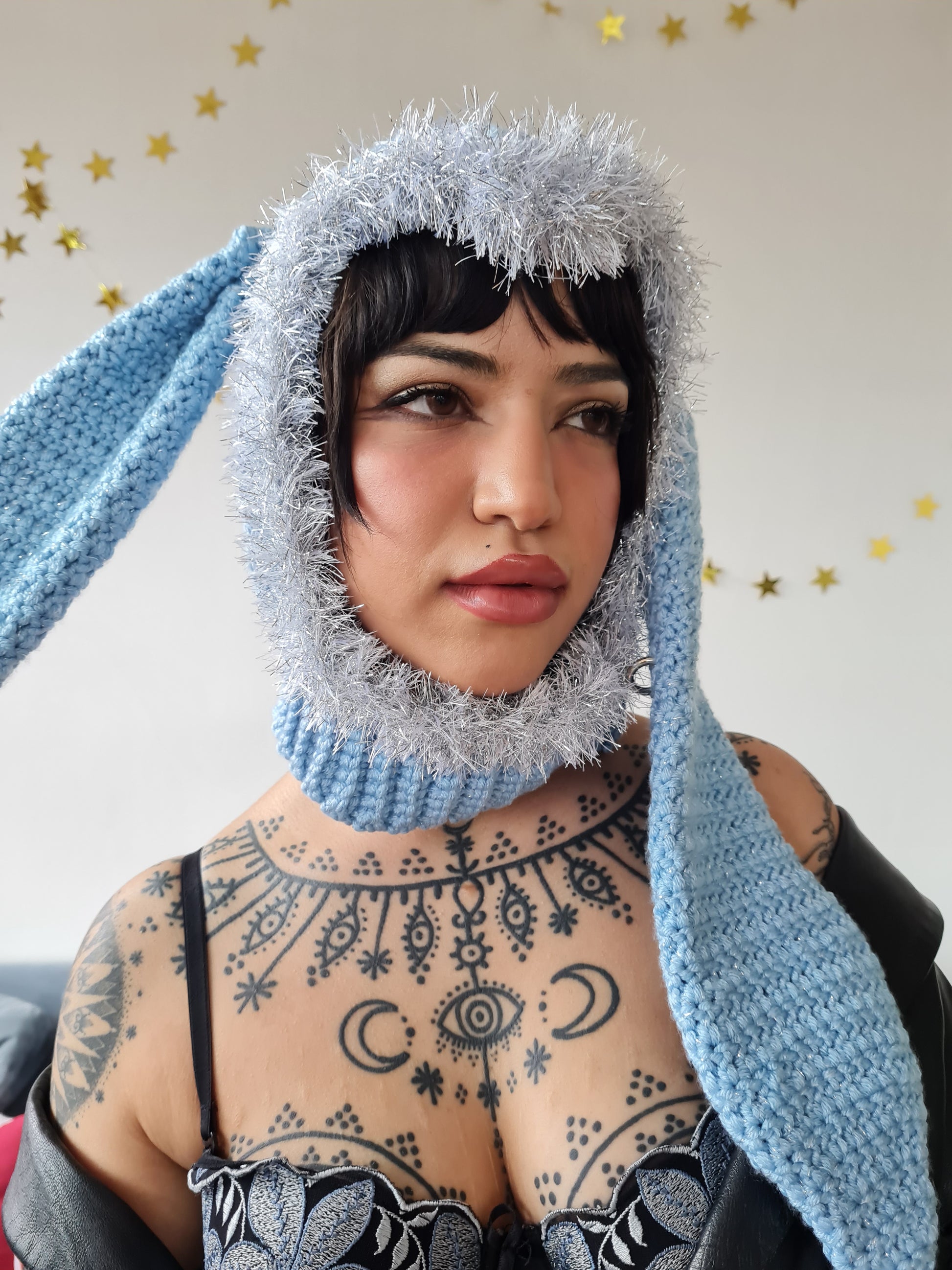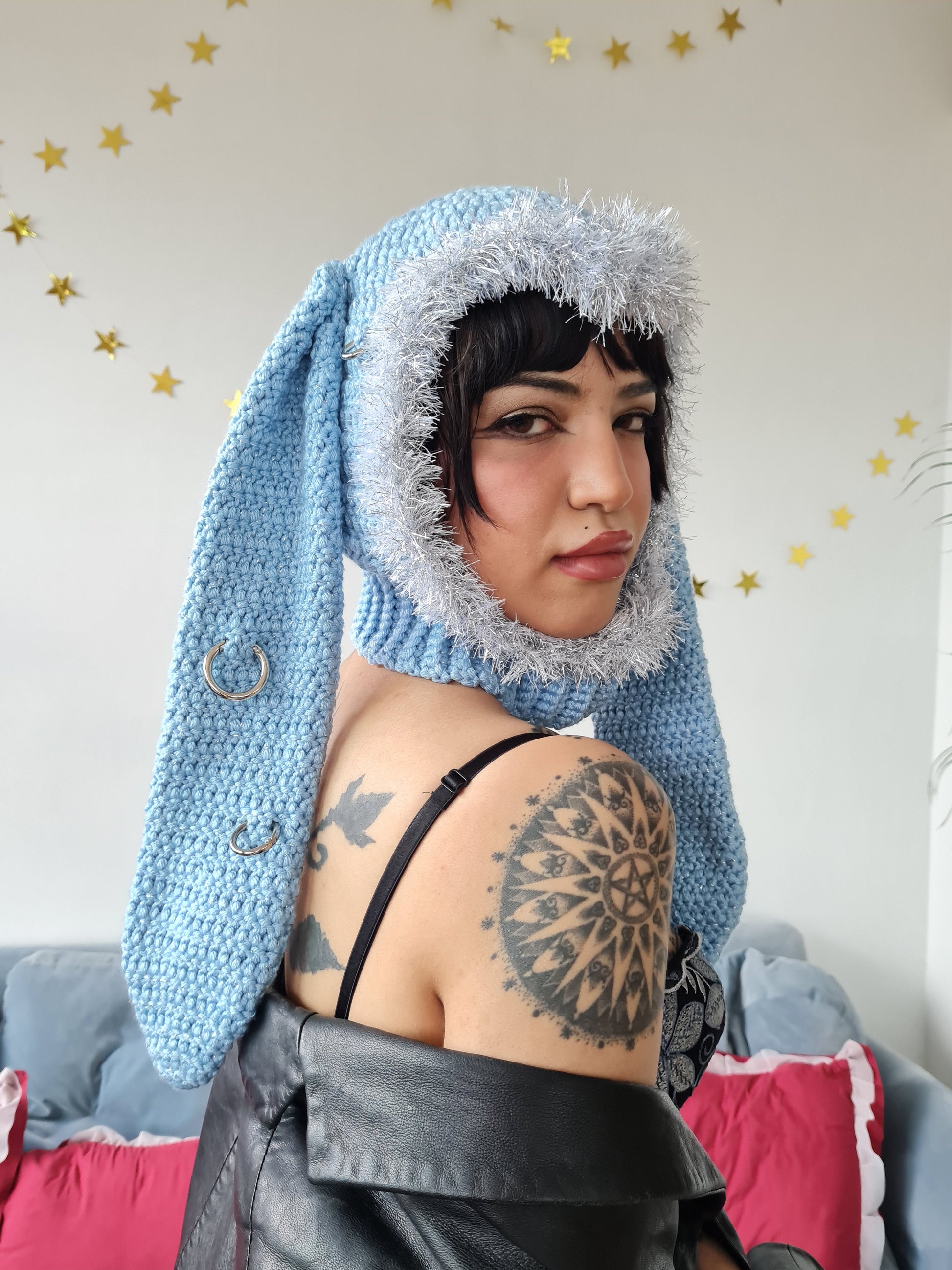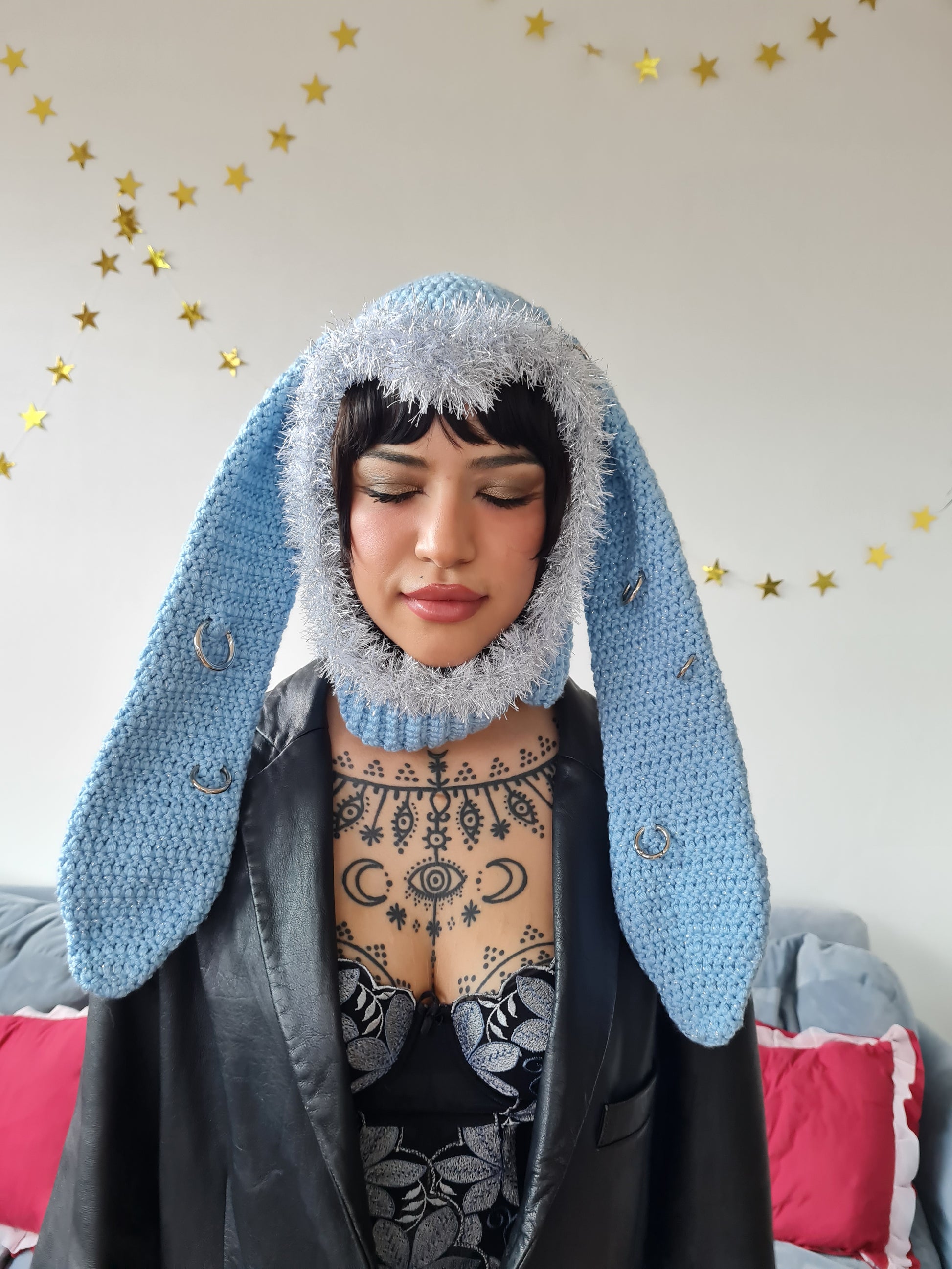 This Bunnyclava features several metal hoops on the head and ears. These will have a unique placement on each piece and are linkable and moveable so you can create your own look!