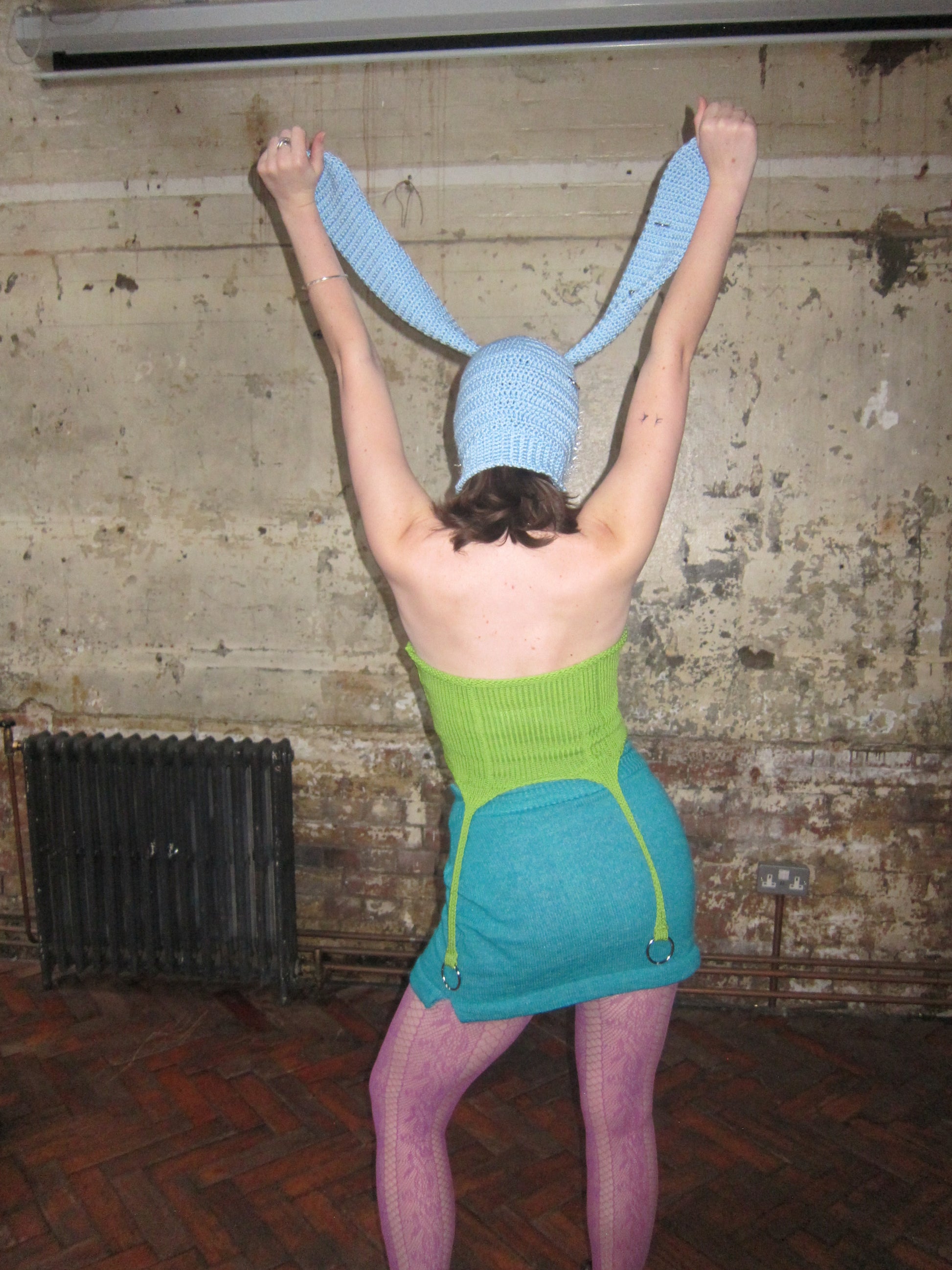 Hanging suspender straps at the front and back that sway as you move with a large o ring at the tip