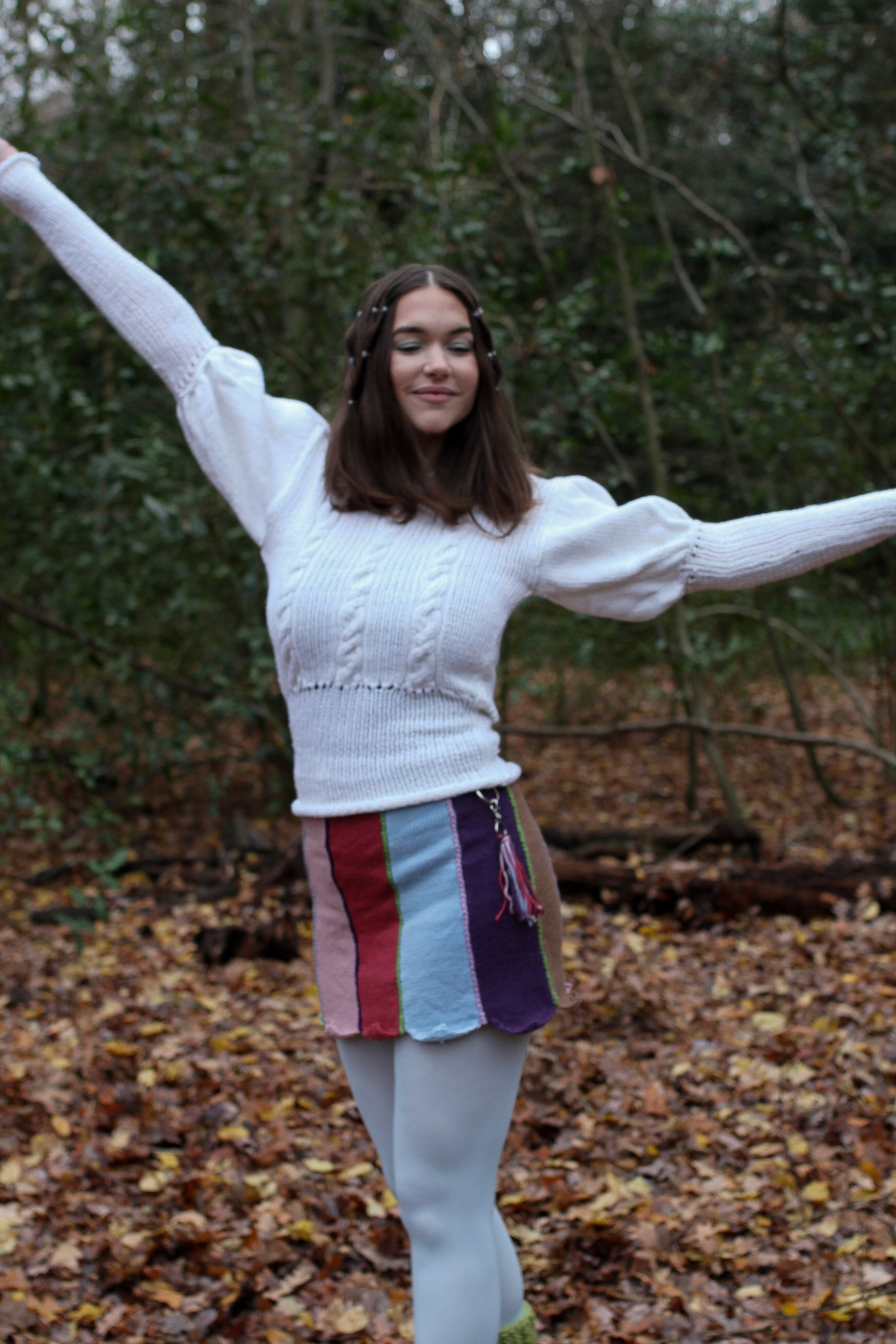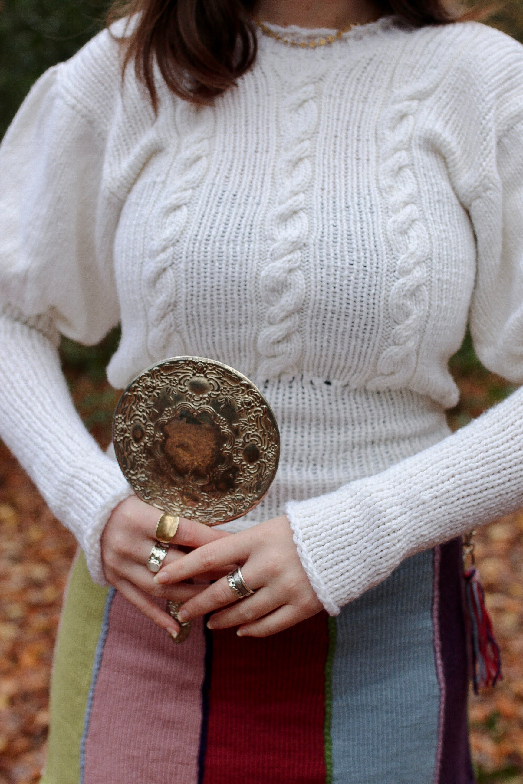 This enchanting white jumper features voluminous puffed sleeves and intricate cables cascading down the front for timeless elegance